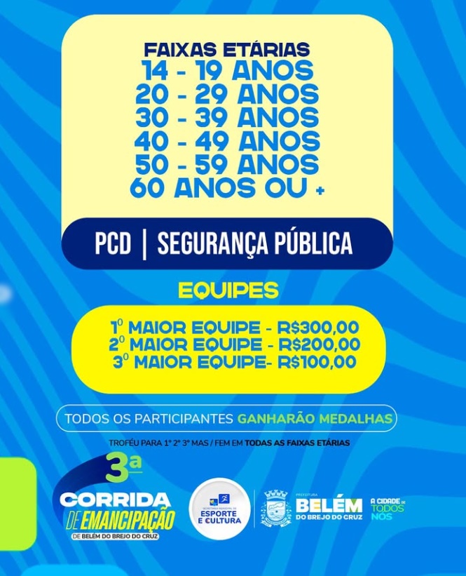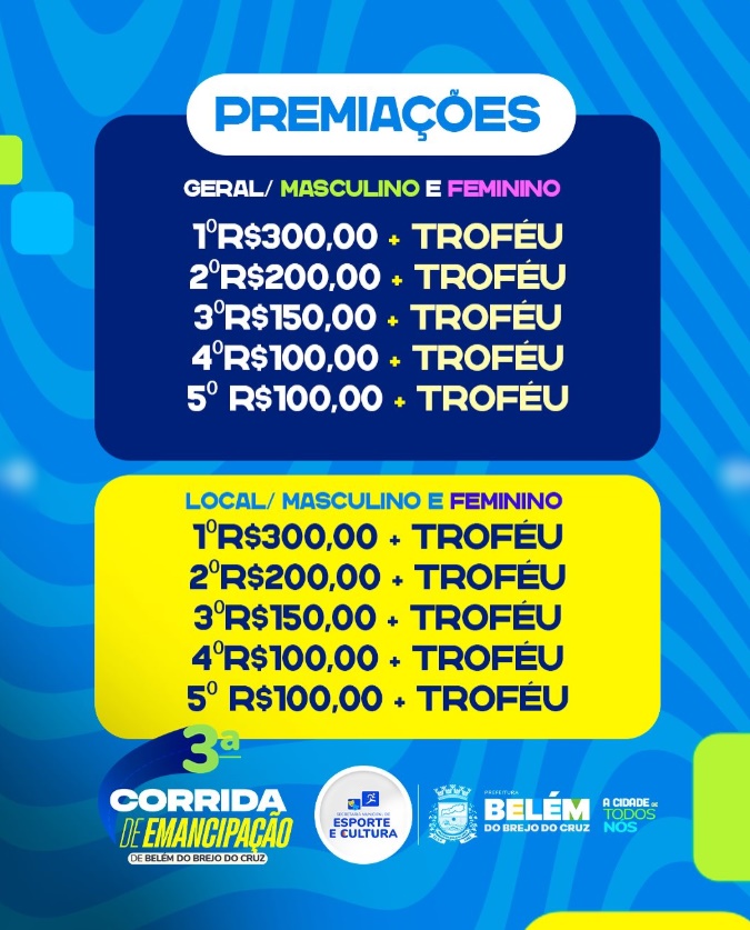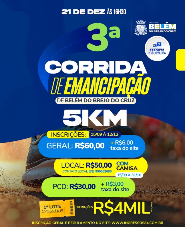 A Prefeitura de Belém do Brejo do Cruz, através da Secretaria Esporte e Cultura anunciou a realização da 3ª edição da Corrida de Emancipação, marcada para o dia 21 de dezembro. O evento esportivo já se consolidou no calendário municipal e promete atrair atletas de várias cidades da região. As inscrições já estão abertas e se encerram no dia 12 de dezembro. Os valores variam conforme o lote e modalidade: R$ 60 no geral mais R$ 6 de taxa do site, R$ 50 com camisa até 31 de outubro e R$ 30 para atletas do PDC, acrescidos de R$ 3 de taxa online.